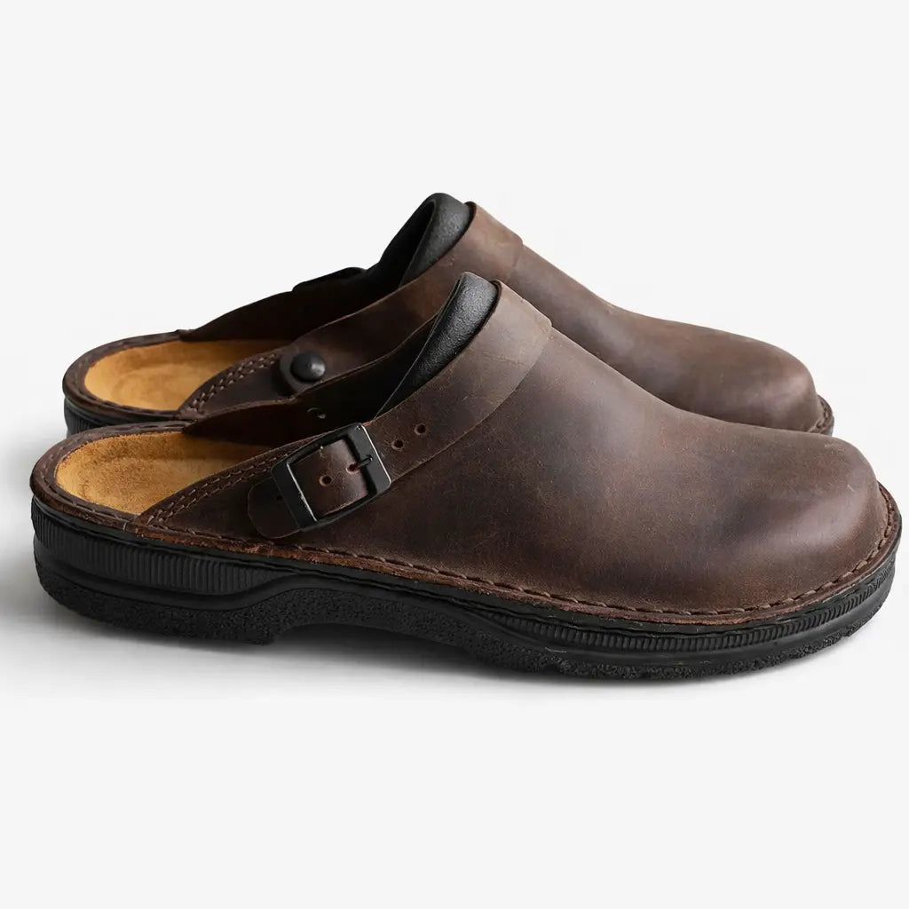Sabots confectionnés en cuir à l’aspect naturel, pensés pour un confort quotidien.